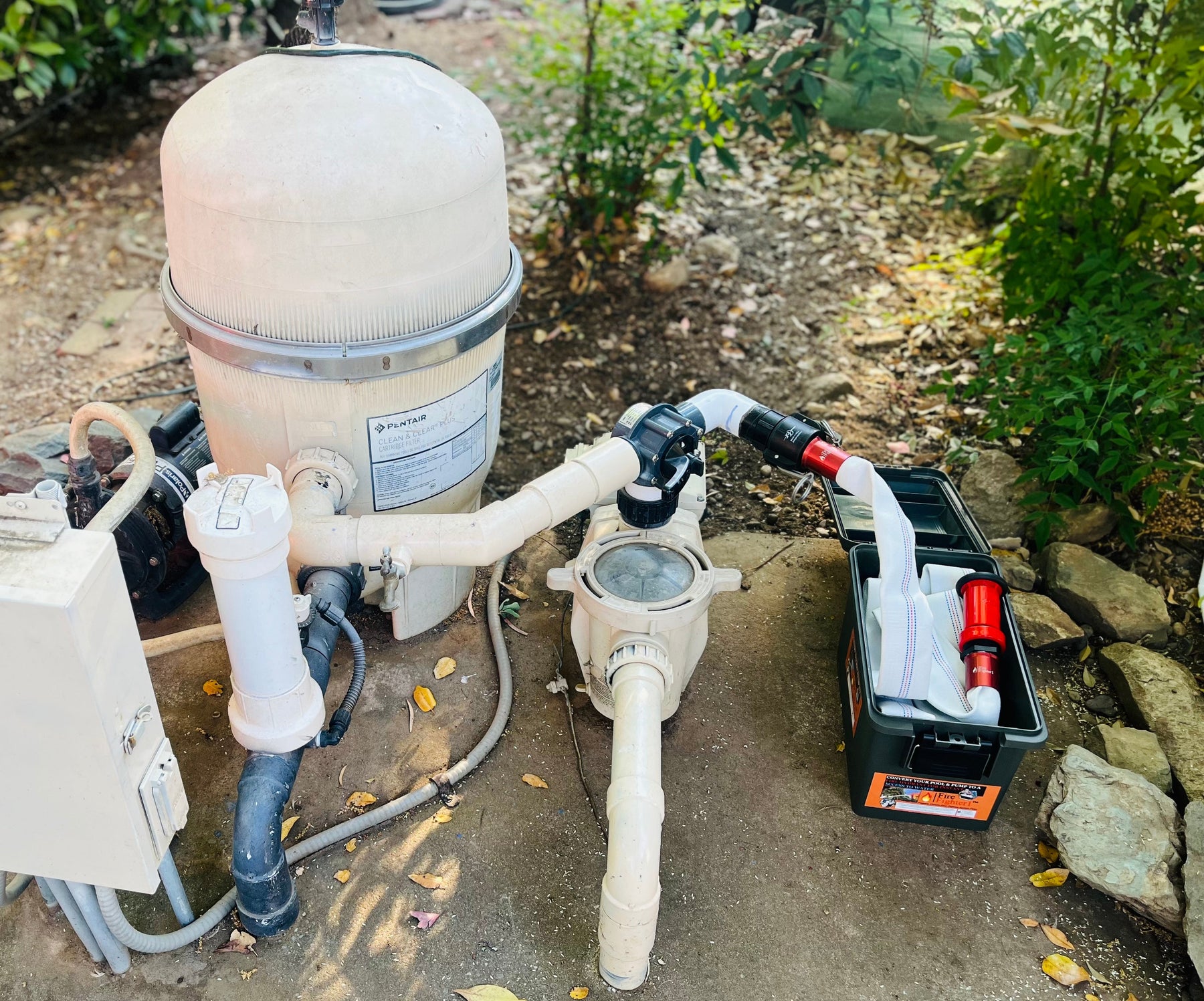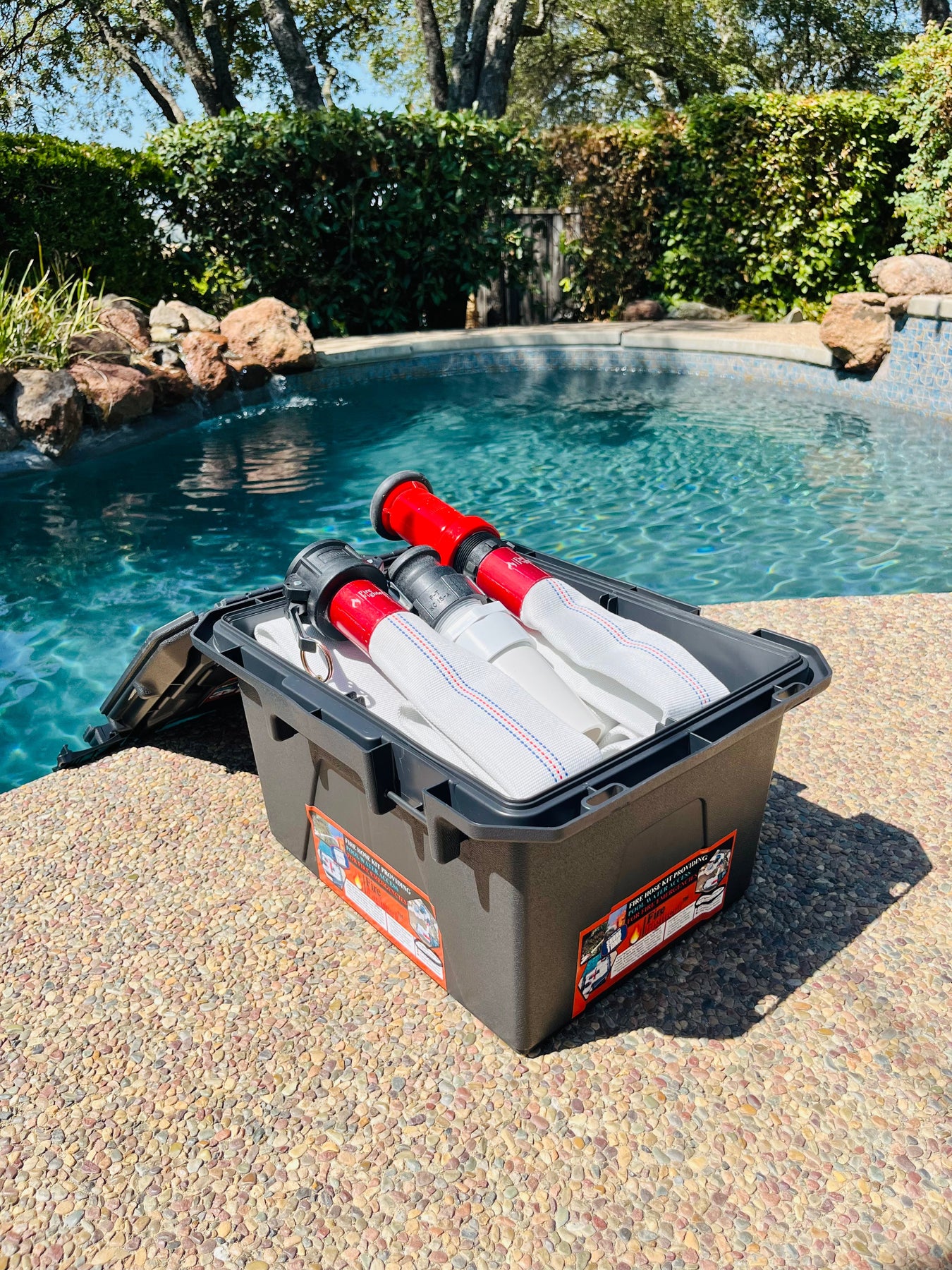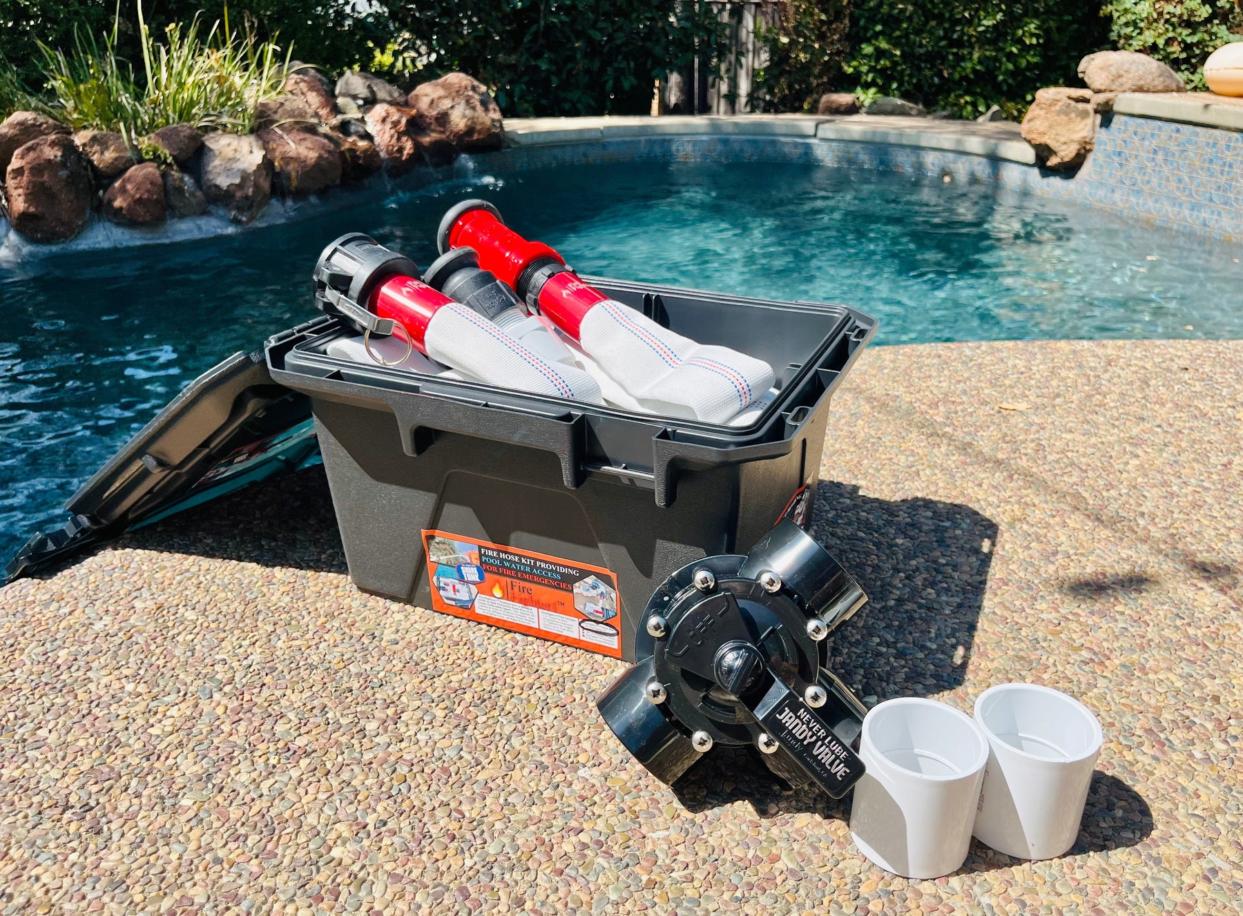 The FireFighter1™ 50 ft hose system connects to a compatible pool plumbing installation kit (such as a 3-way diverter valve) to allow homeowners to use existing pool water as a high-flow fire hose during fire emergencies.